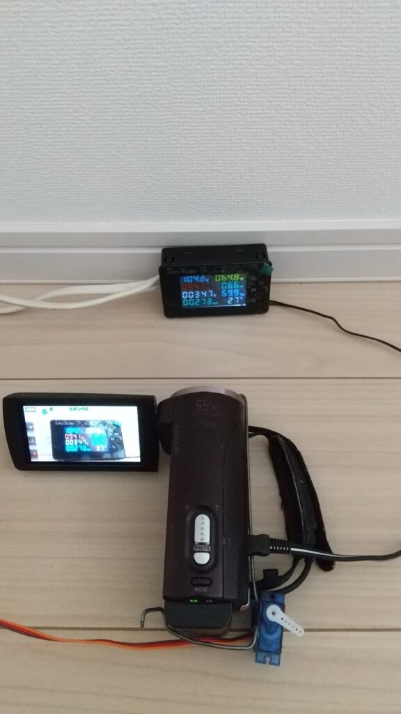 エアコンのプラグとコンセントの間に積算電力計を設置し、30分ごとに消費電力(kWh)記録したい。そのために手持ちの古いビデオカメラにサーボモーター(マイコンで制御)を取り付け30分ごとに録画・停止ボタンを自動で操作する装置を自作しました。